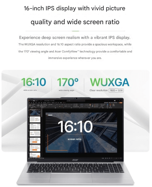 Acer ComfyView™ LED-backlit TFT LCD with 16:10 aspect ratio