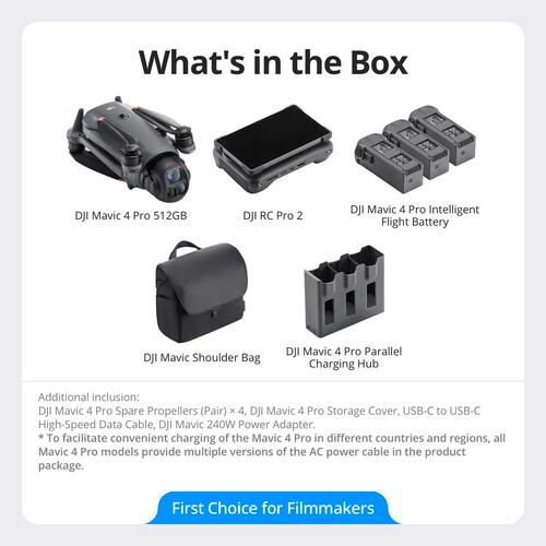 The DJI Mavic 4 Pro 512GB Creator Combo offers a powerful combination of camera, flight performance, and storage. It features a 100MP Hasselblad camera, dual tele cameras, and up to 51 minutes of flight time. The combo includes a 512GB internal storage, DJI RC Pro 2 remote controller, and additional accessories like extra batteries and a charging hub.