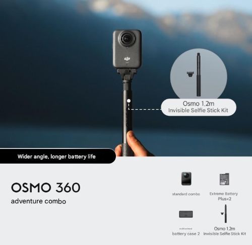 The DJI Osmo 360 Adventure Combo is an 8K 360-degree action camera kit that includes the camera, three batteries, a multifunctional charging case, a 1.2m invisible selfie stick, and other key accessories. It features a large 1-inch sensor for excellent image quality and low-light performance.